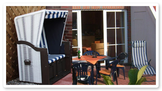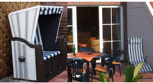 Die eigene Terasse ist neben besonders großem Familientisch mit sechs Sitzplätzen mit einem gemütlichen Strandkorb und zwei Wellnessliegen ausgestattet. |