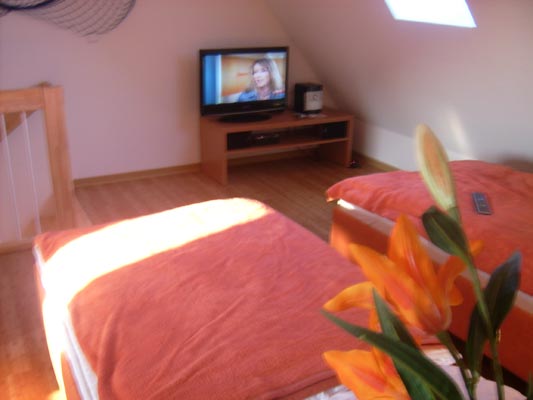 Im großzügig ausgebauten Dachboden gibt es ein weiteres Doppelbett, Flachbildschirm, Stereoanlage